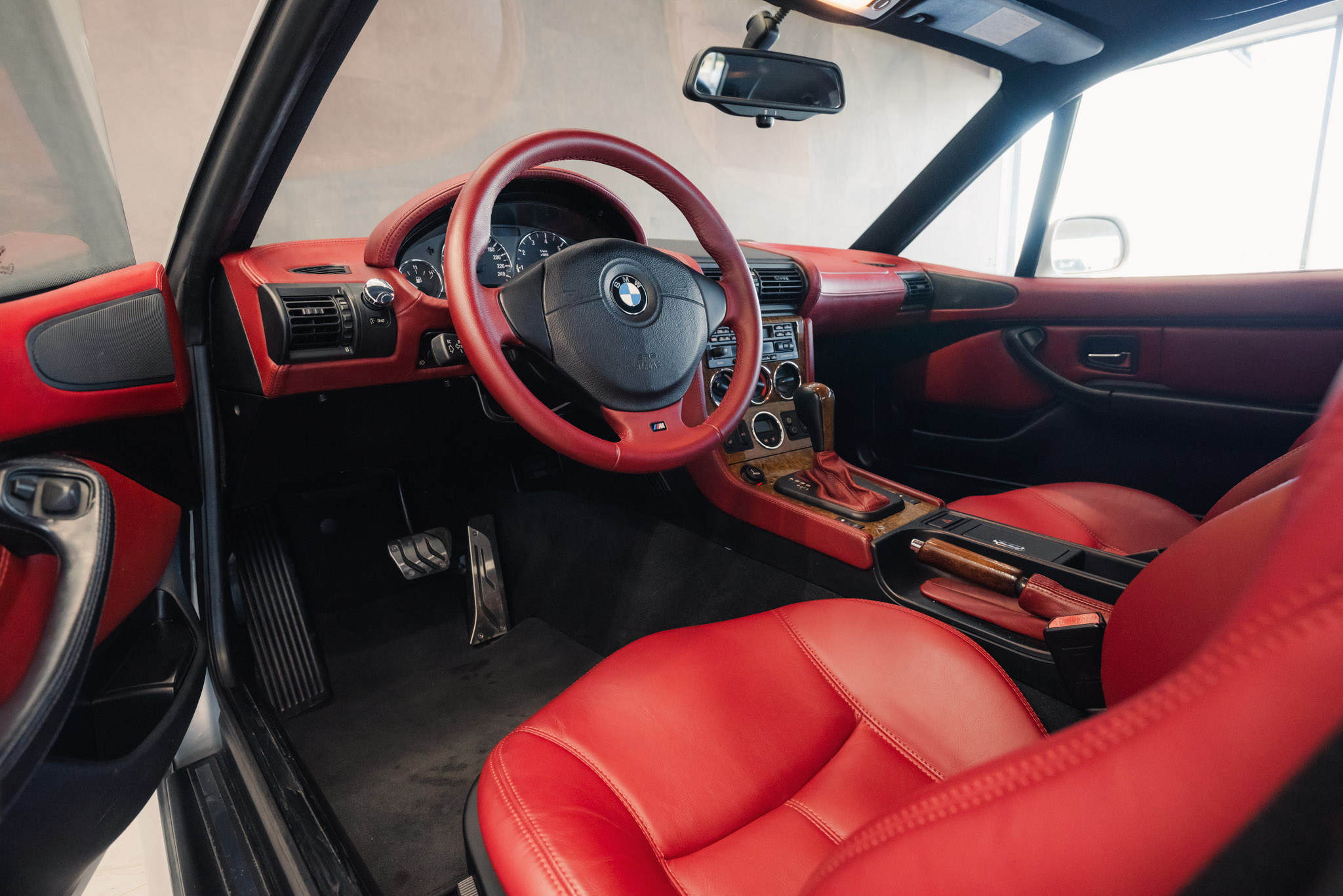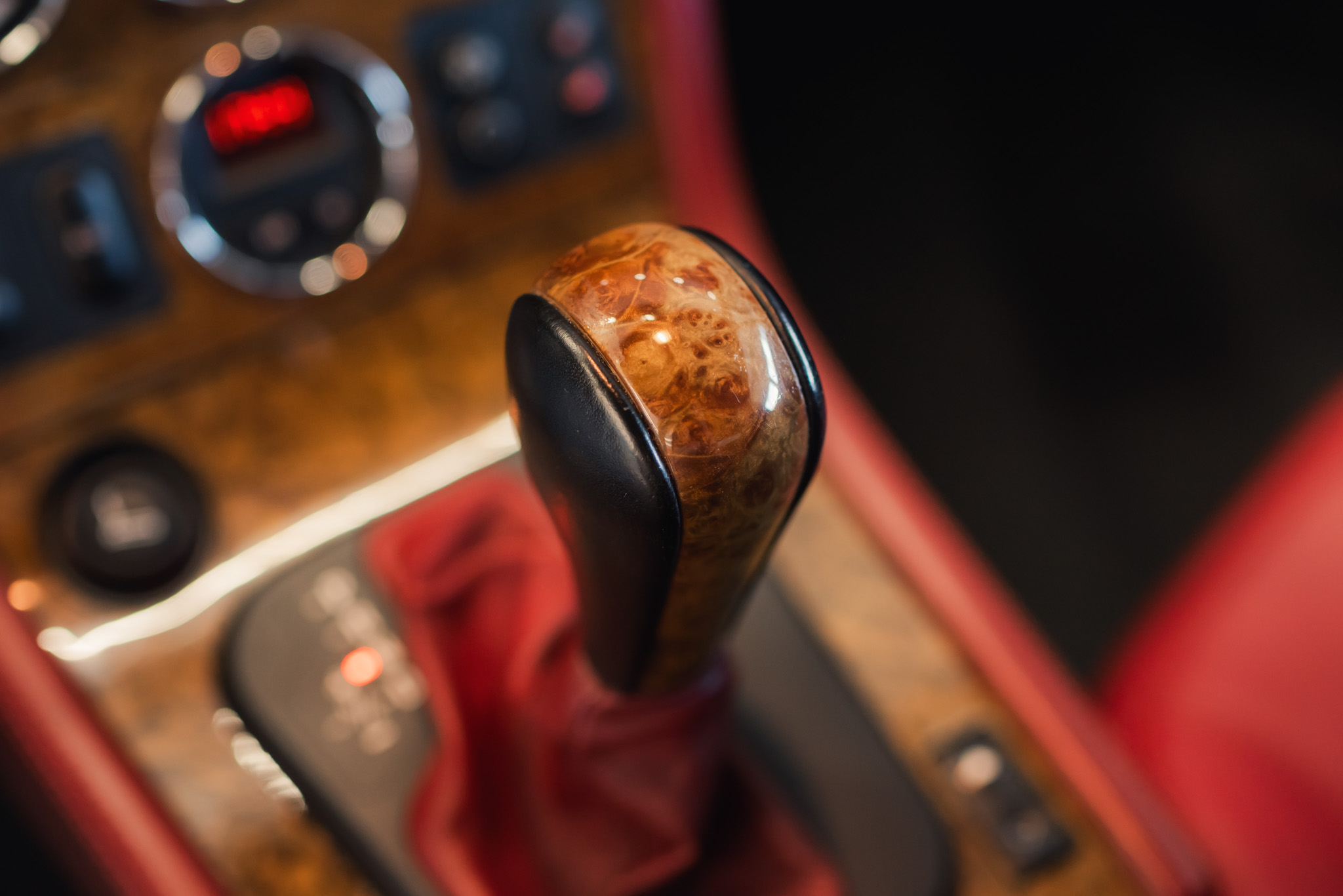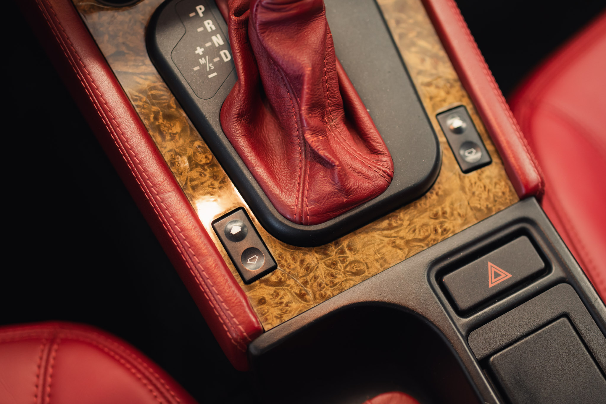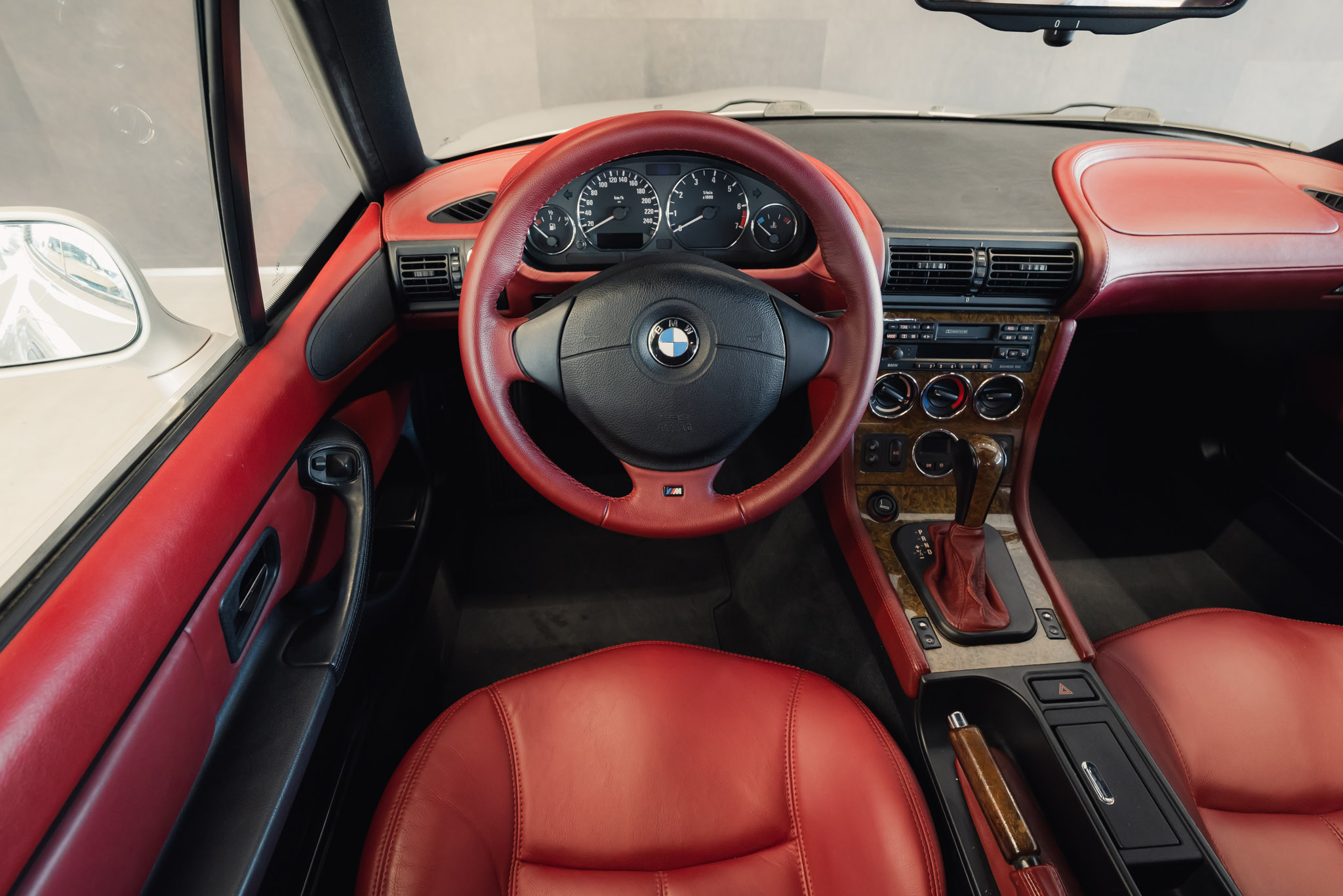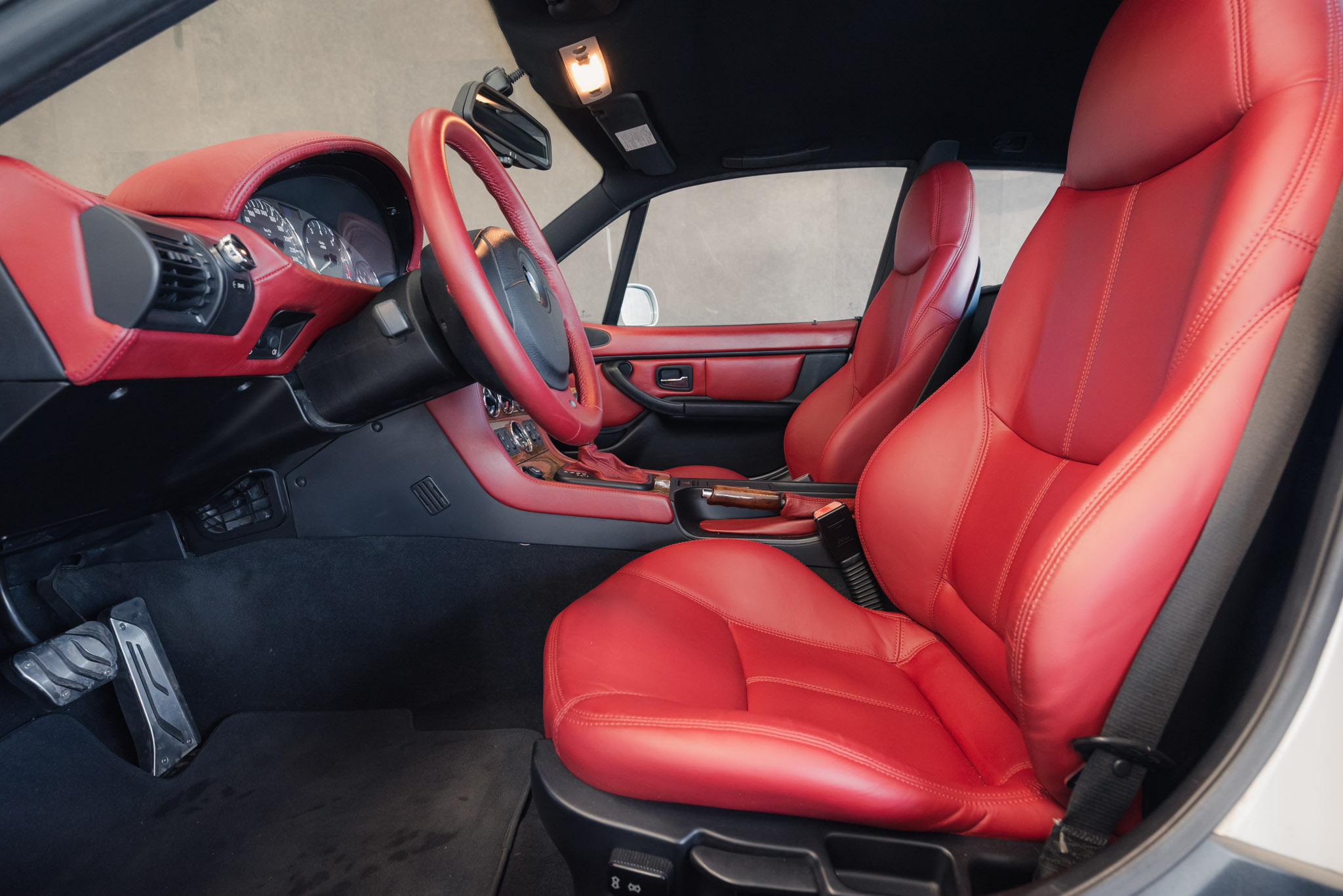 - Wykończenie wnętrza: czerwona skóra + wstawki drewniane (orzech)