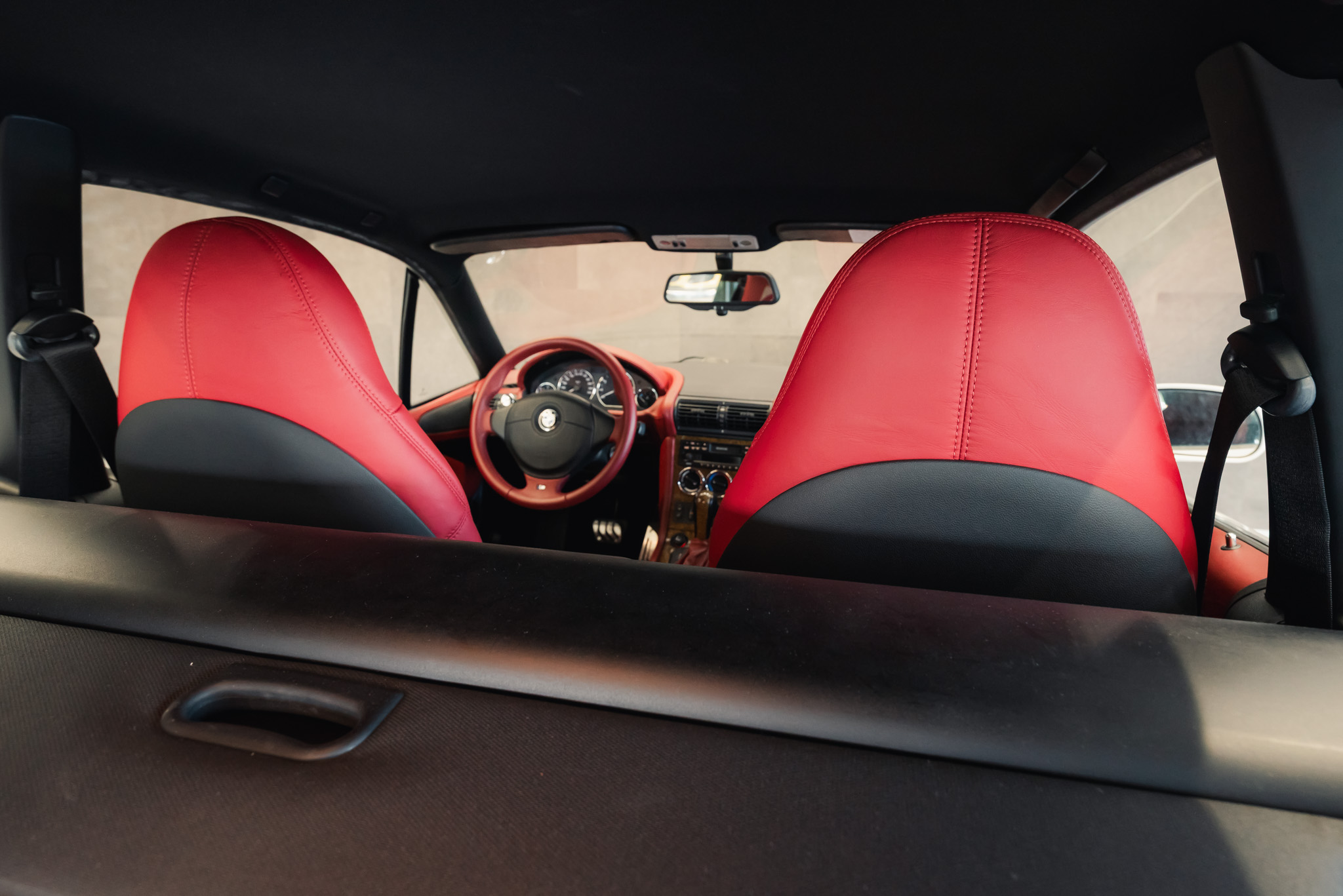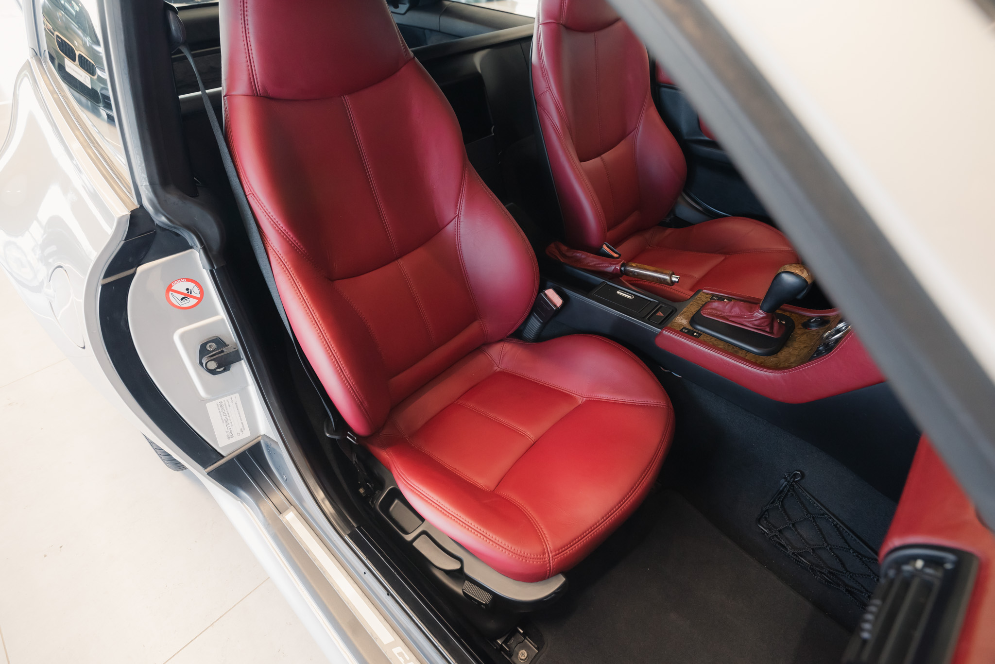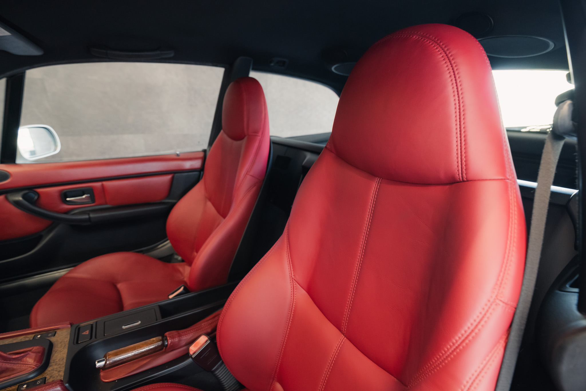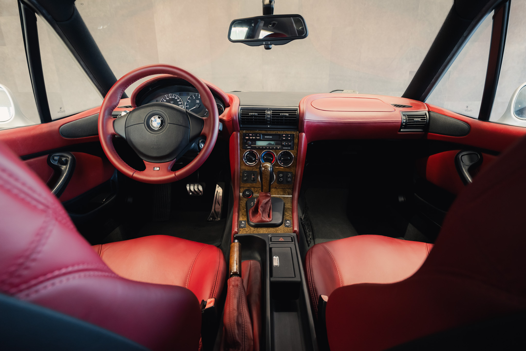 - Wykończenie wnętrza: czerwona skóra + wstawki drewniane (orzech)