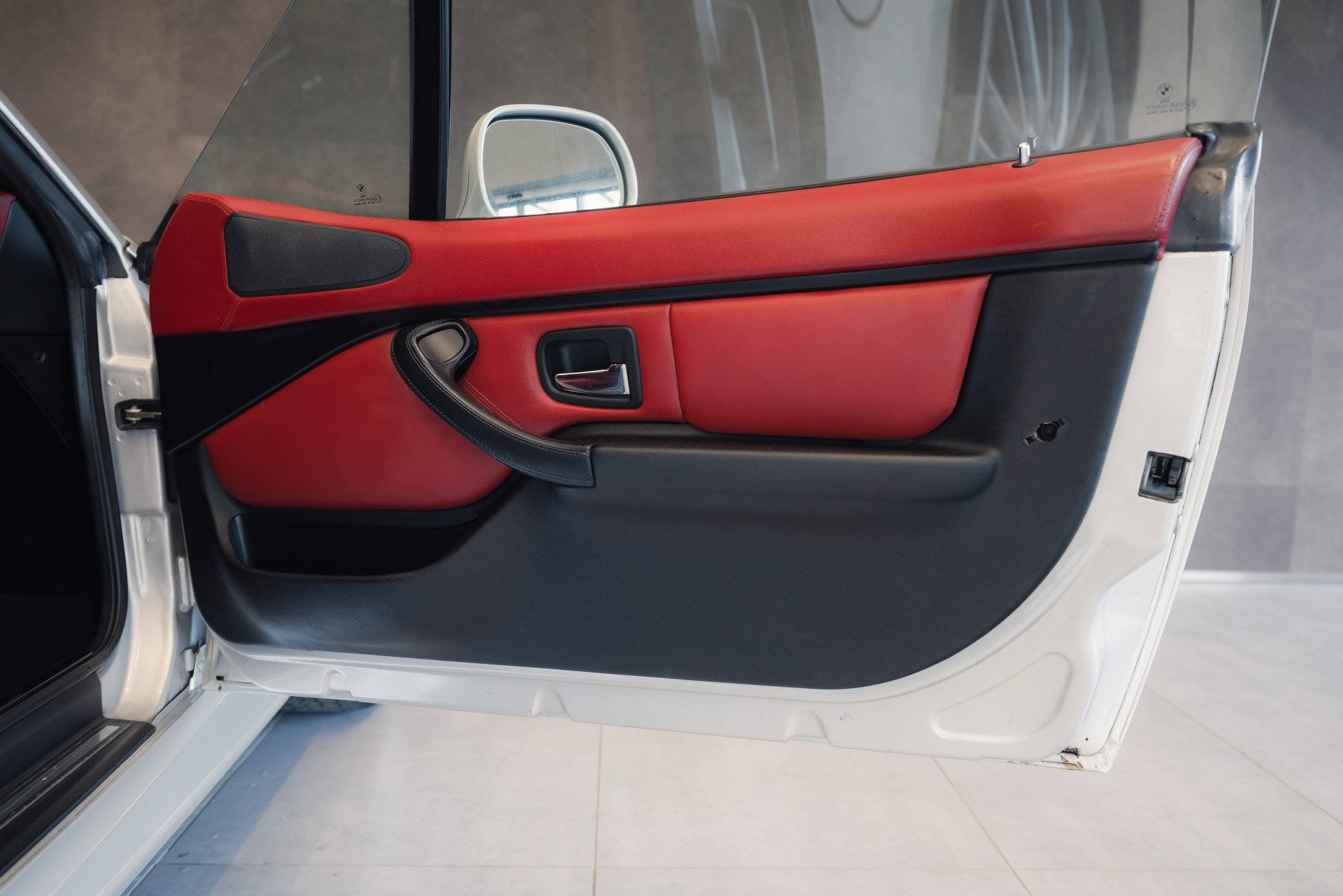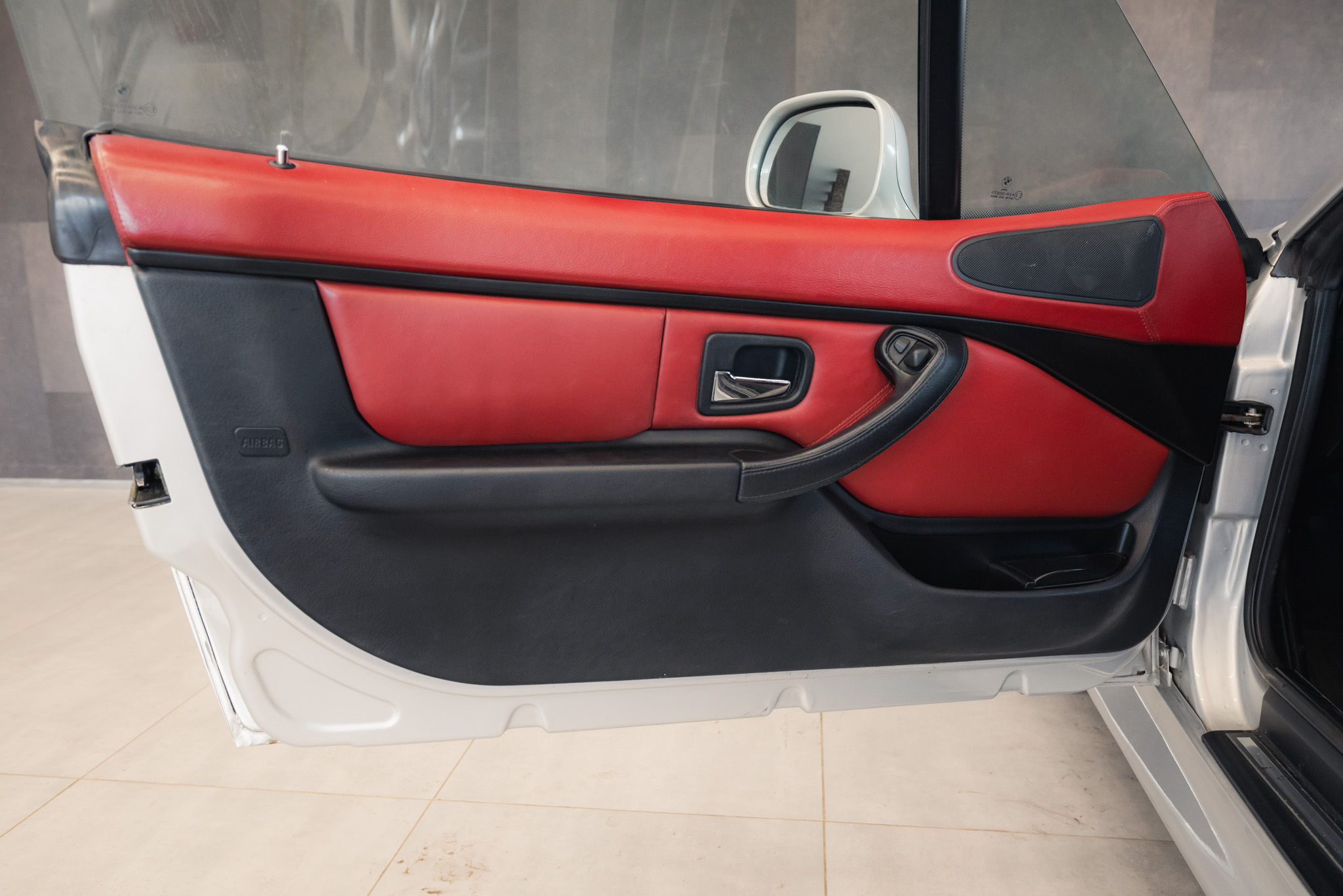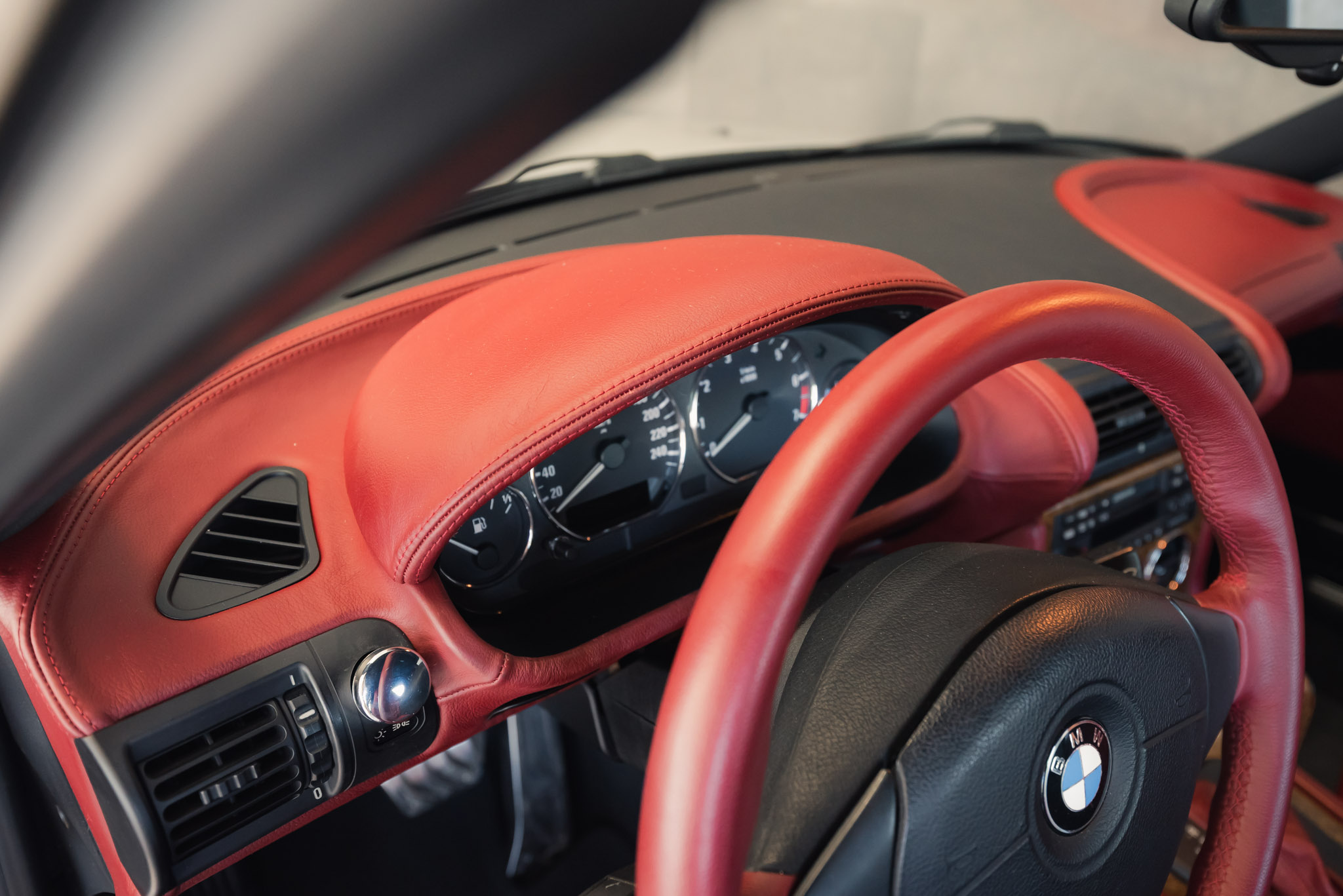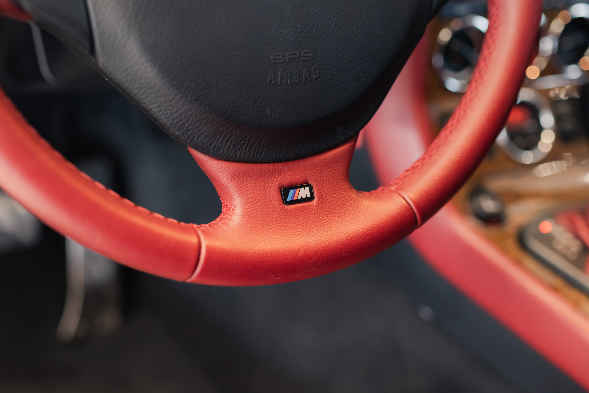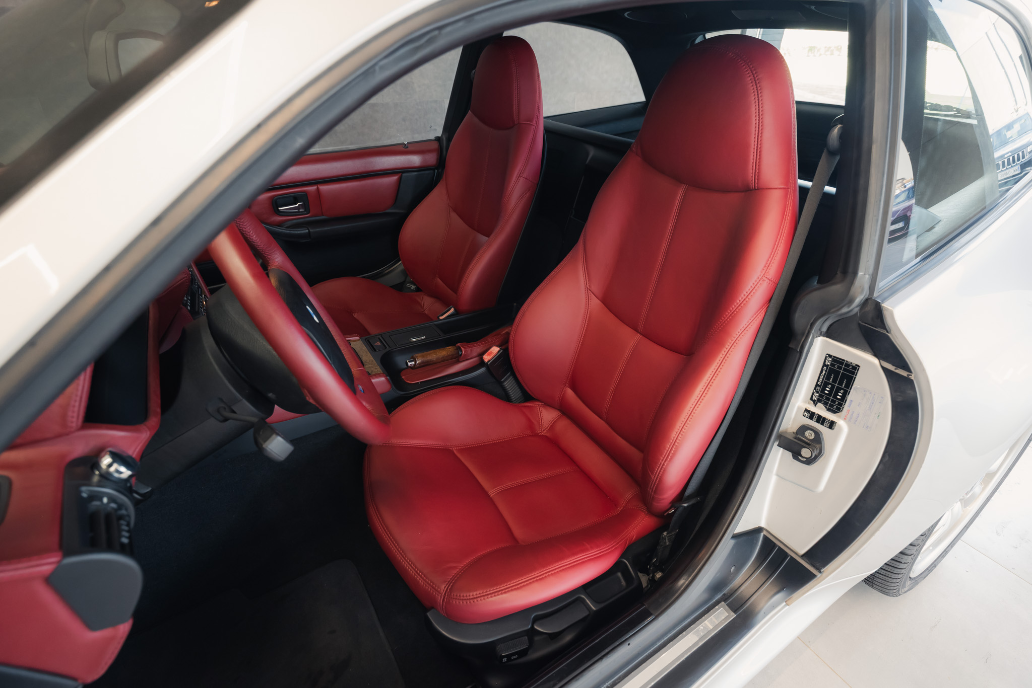- Wykończenie wnętrza: czerwona skóra + wstawki drewniane (orzech)