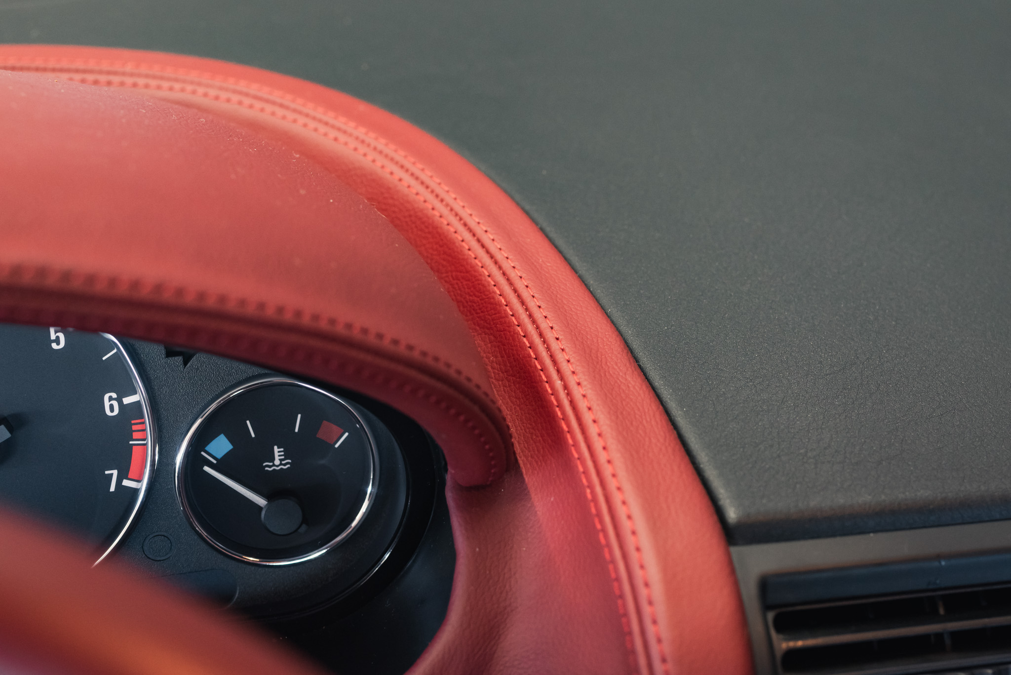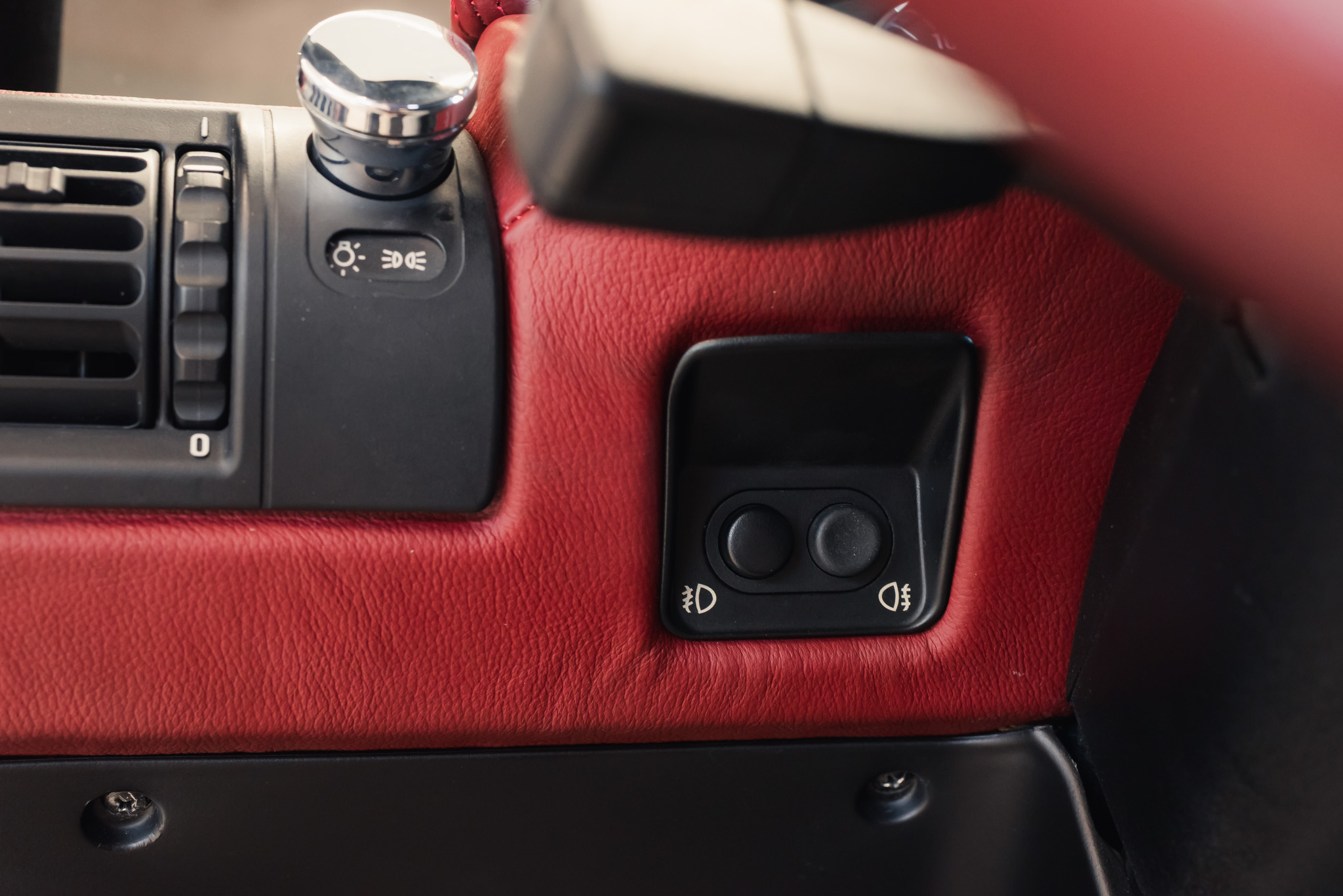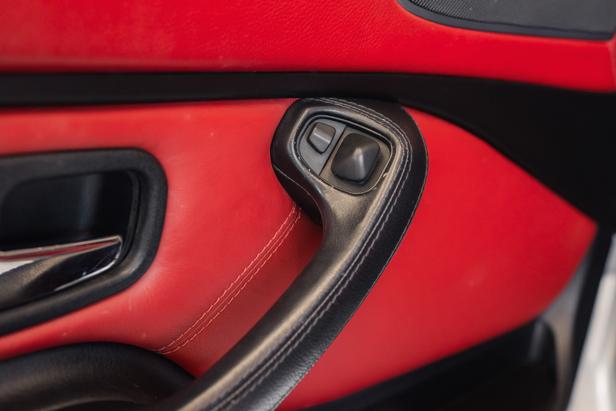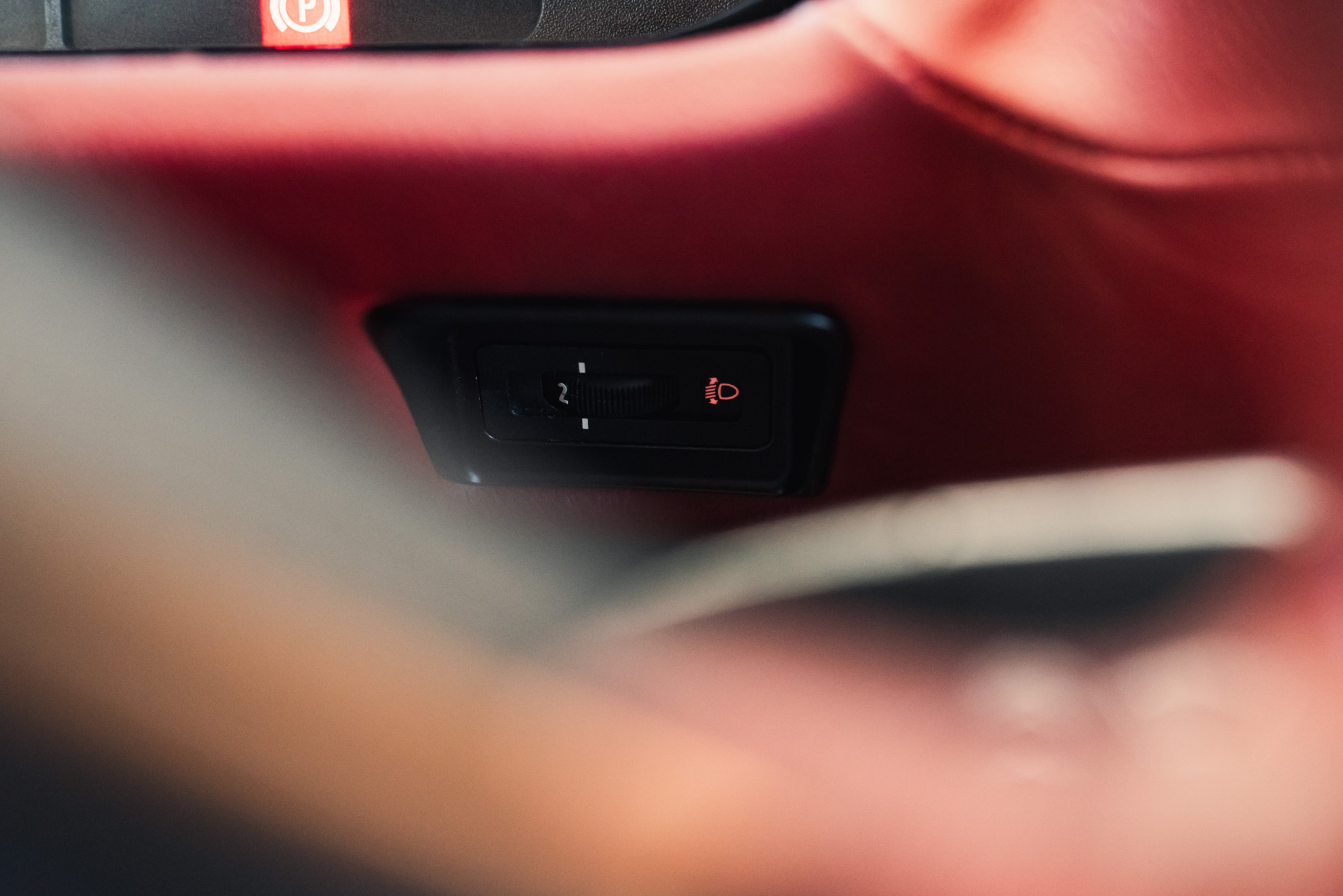 - Wykończenie wnętrza: czerwona skóra + wstawki drewniane (orzech)