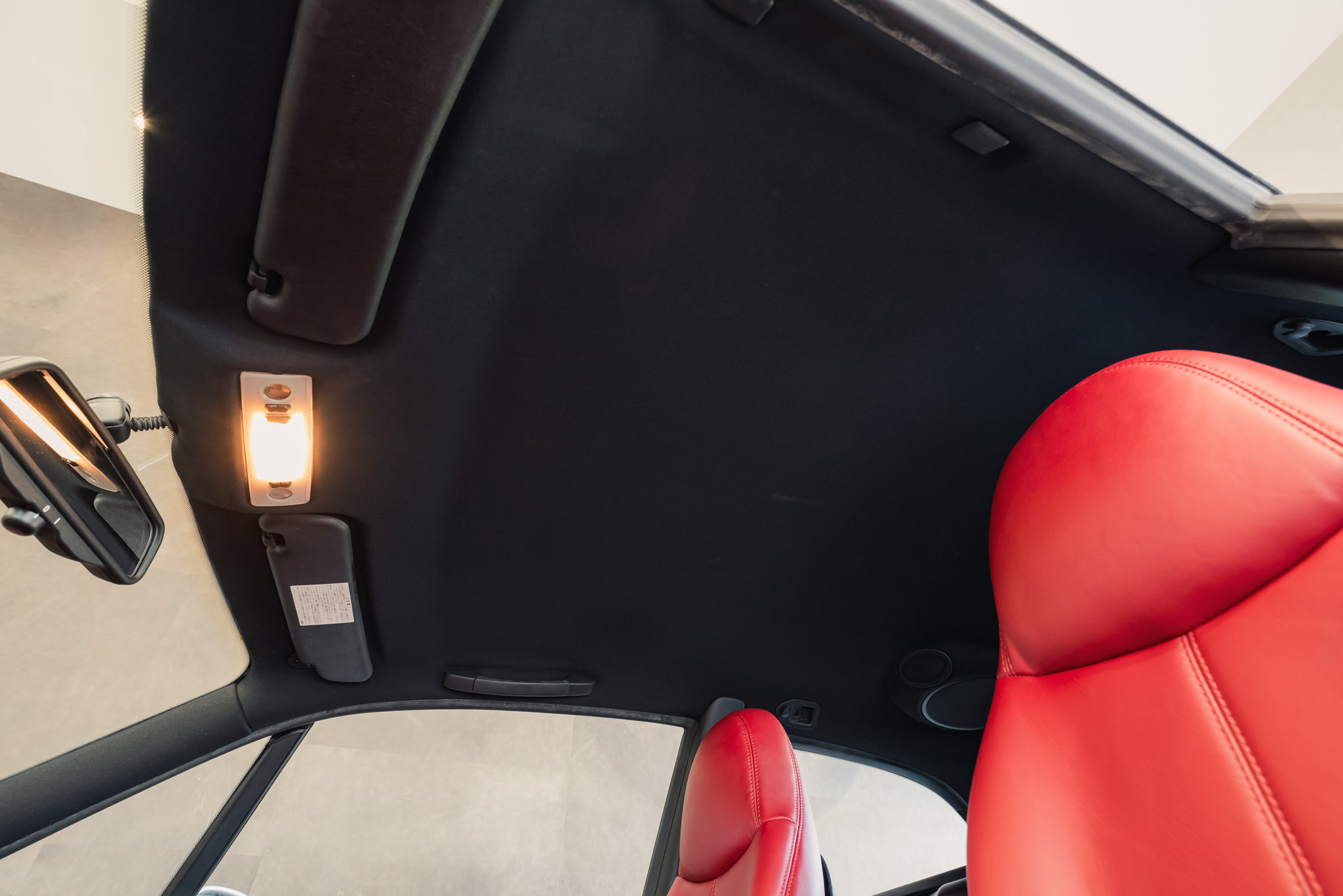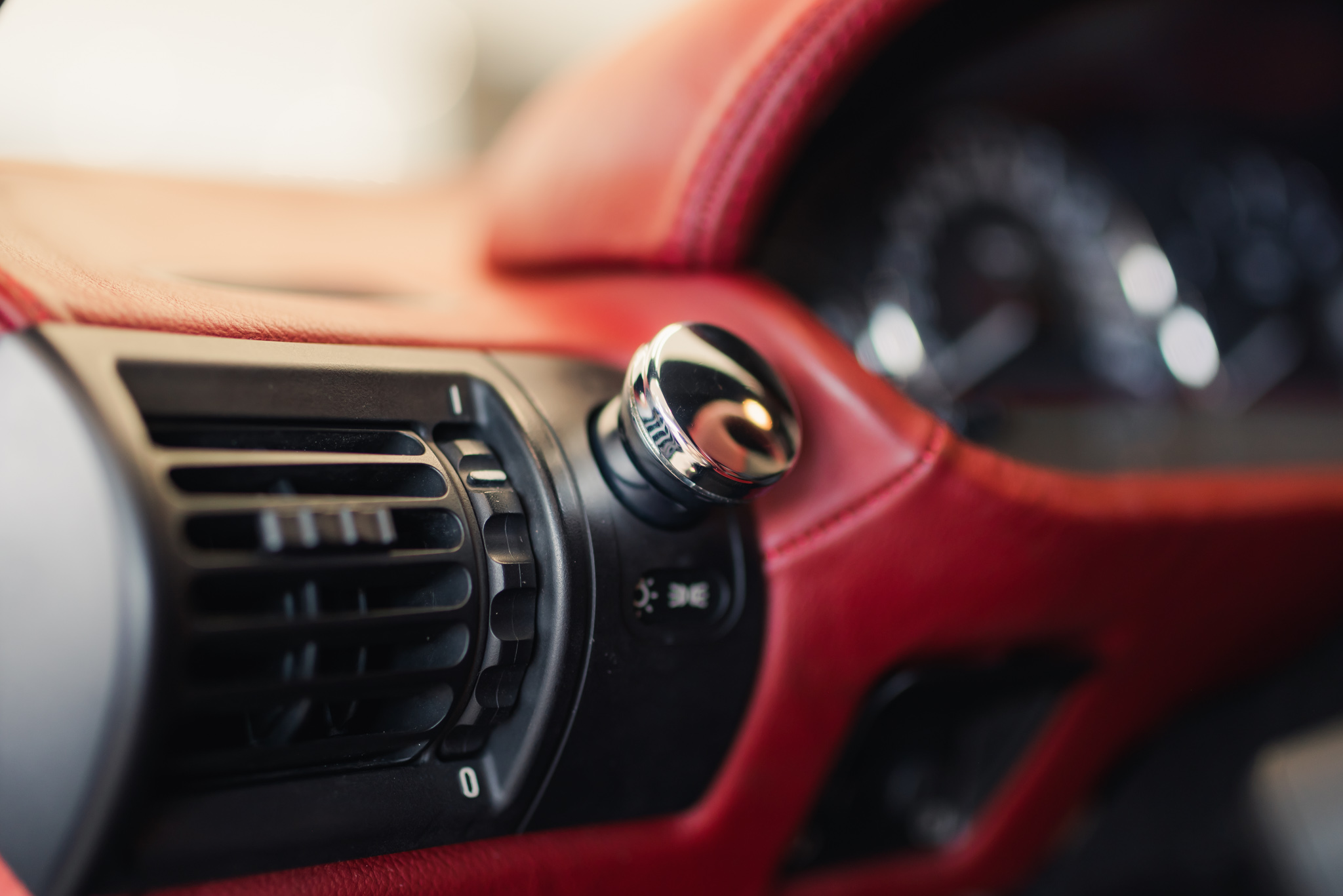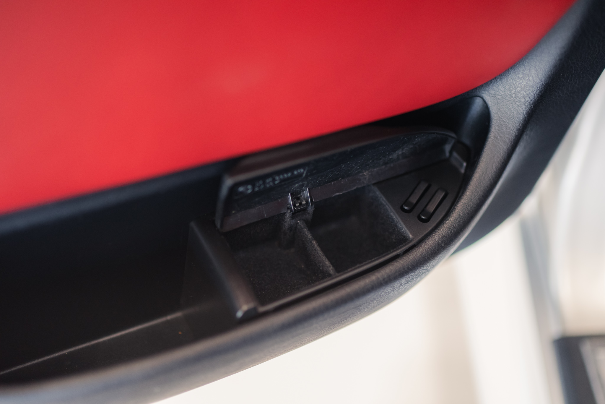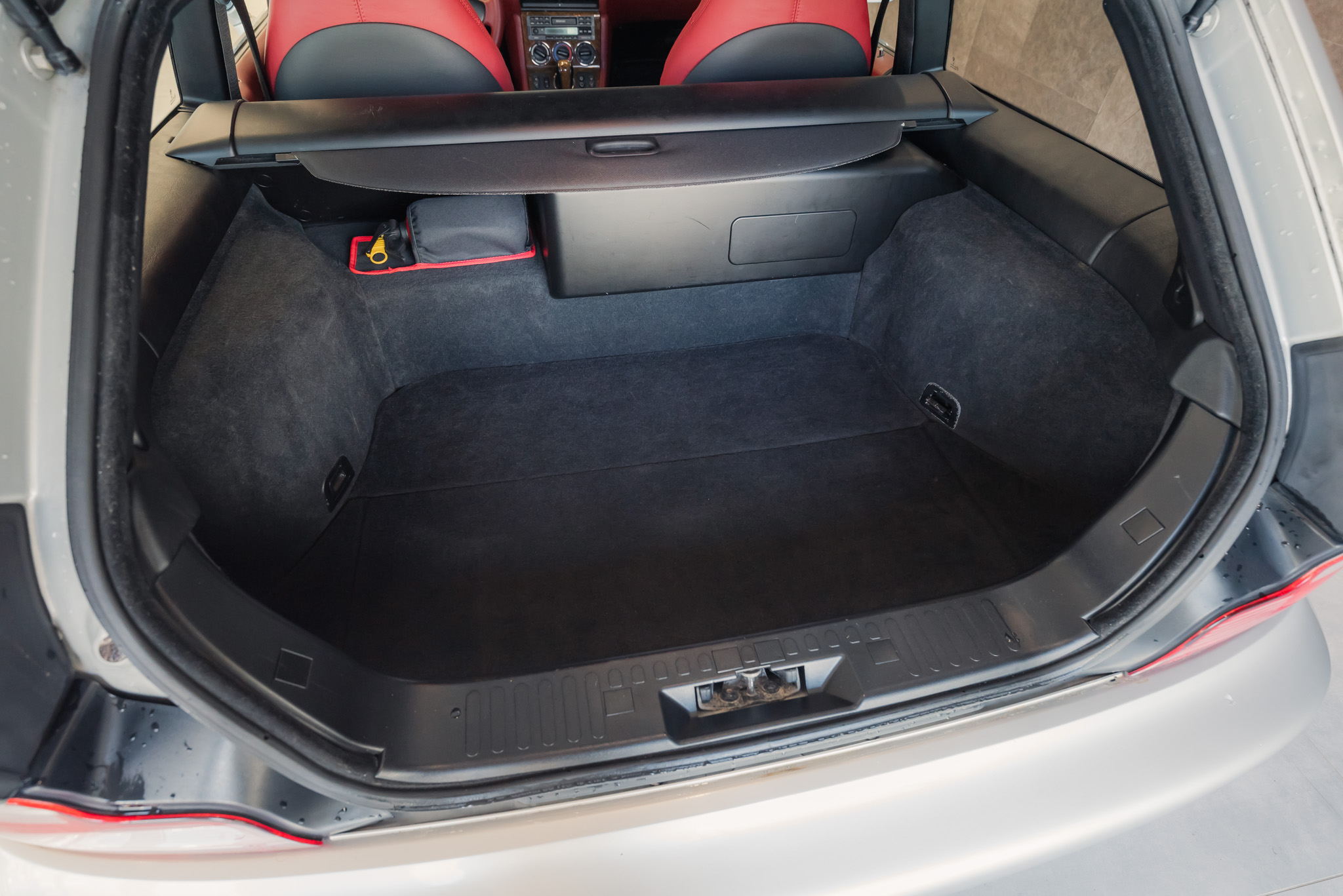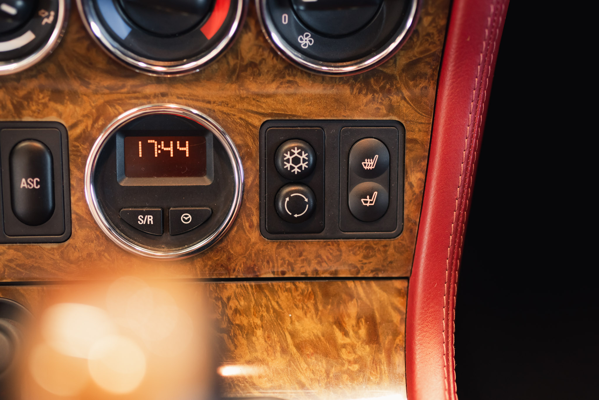 - Wykończenie wnętrza: czerwona skóra + wstawki drewniane (orzech)