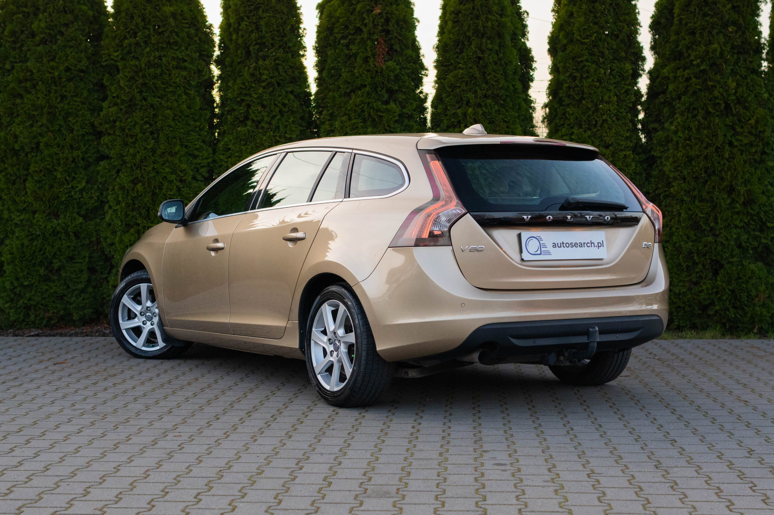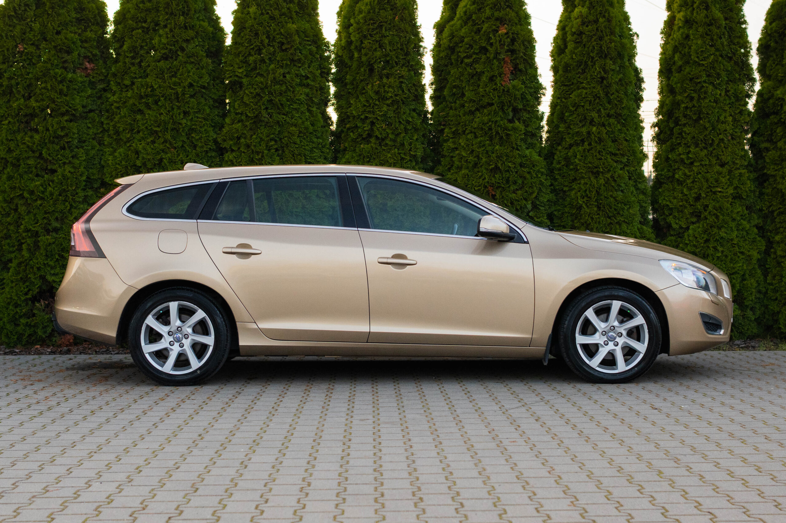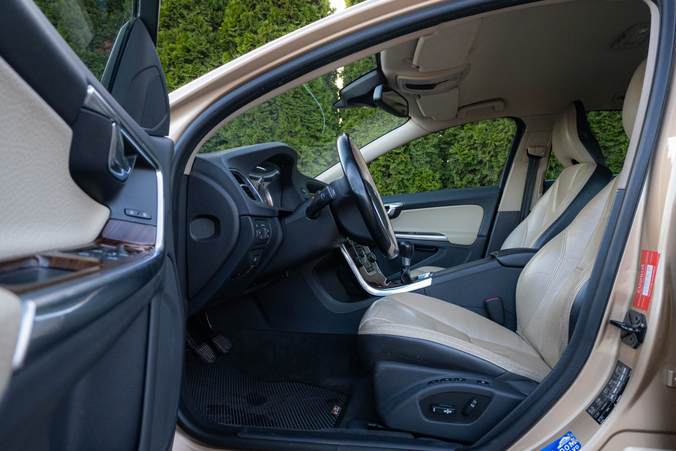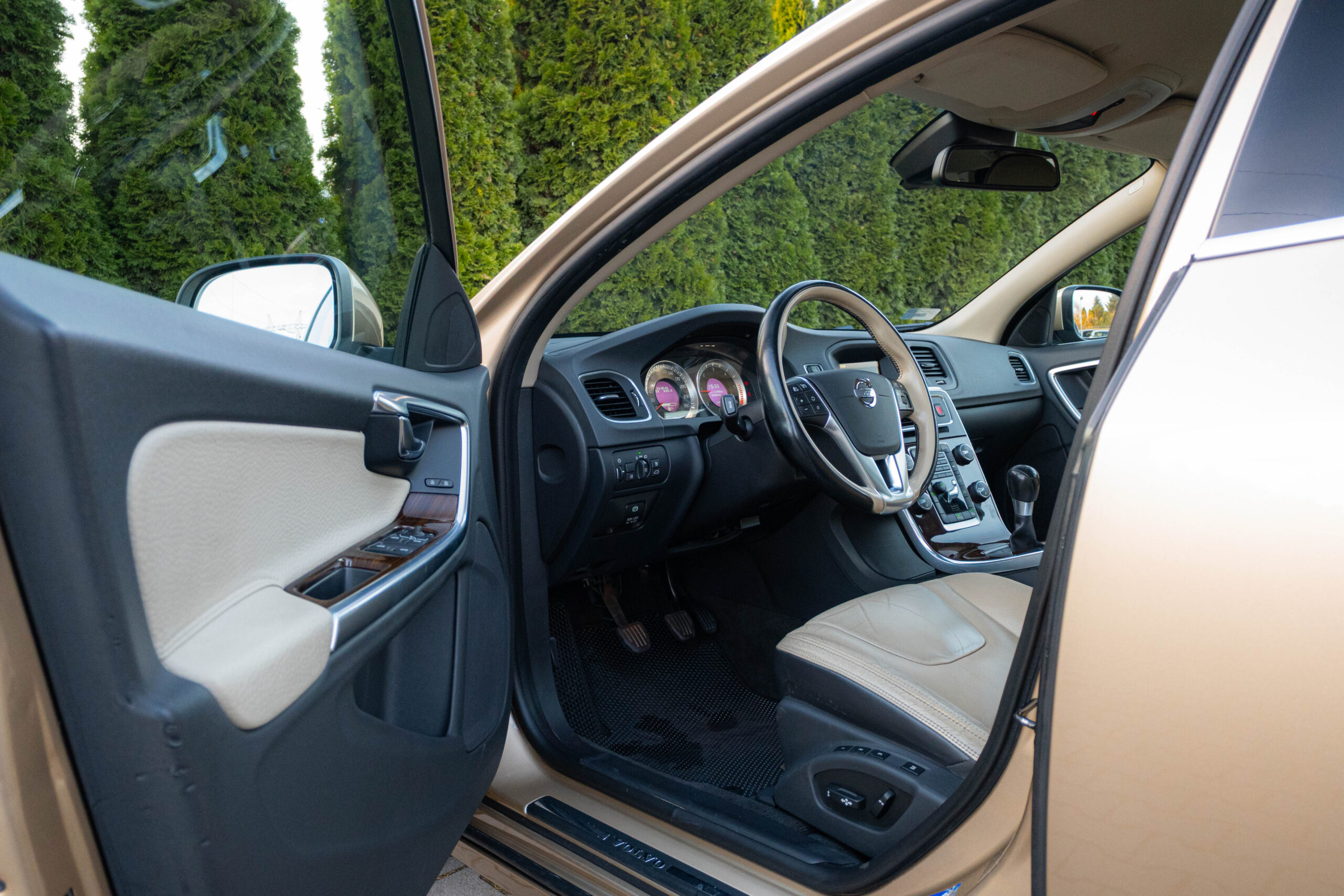 Dziś gościmy Volvo V60 w odmianie wysokoprężnej D3 w bardzo ciekawym zestawieniu kolorystycznym. Rzadki lakier Electrum Gold Metallic łączy się tu z beżowym wnętrzem ozdobionym elementami wykończeniowymi w stylistyce drewna. Ciekawym zabiegiem stylistycznym jest dwukolorowe koło kierownicze, dodające wnętrzu nutę luksusu.