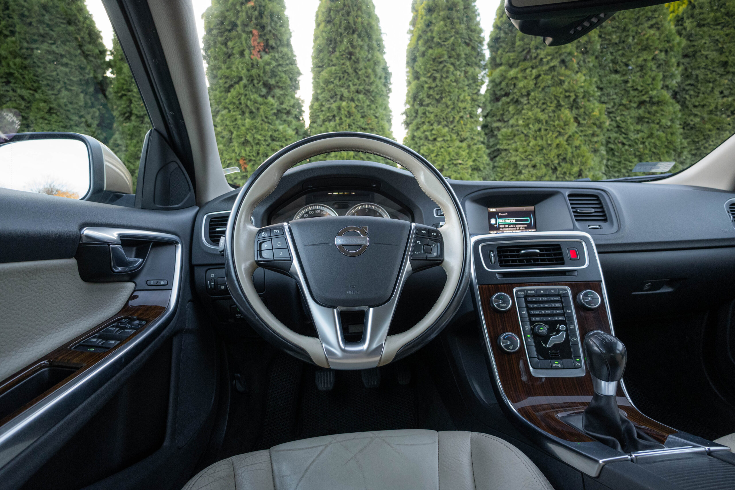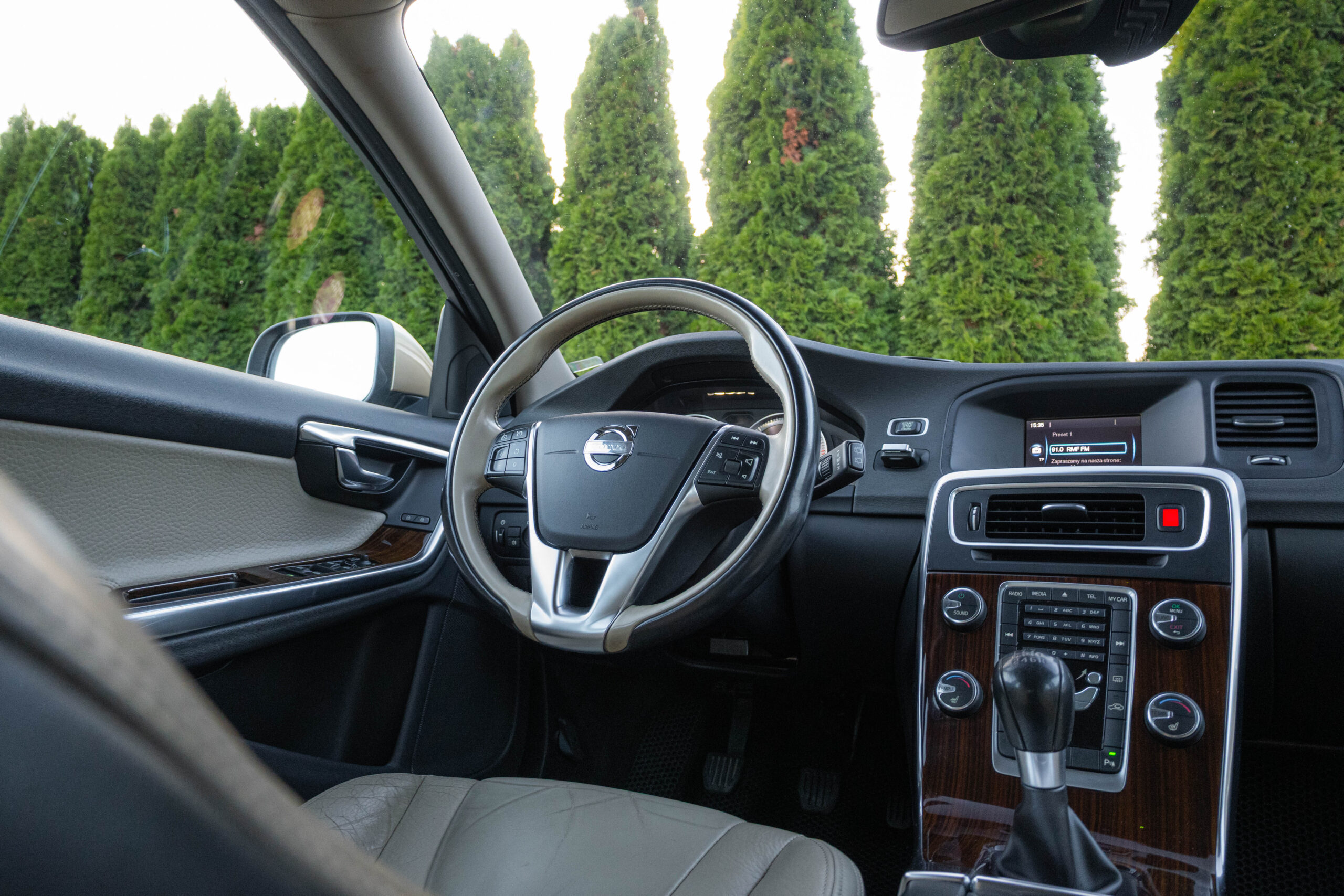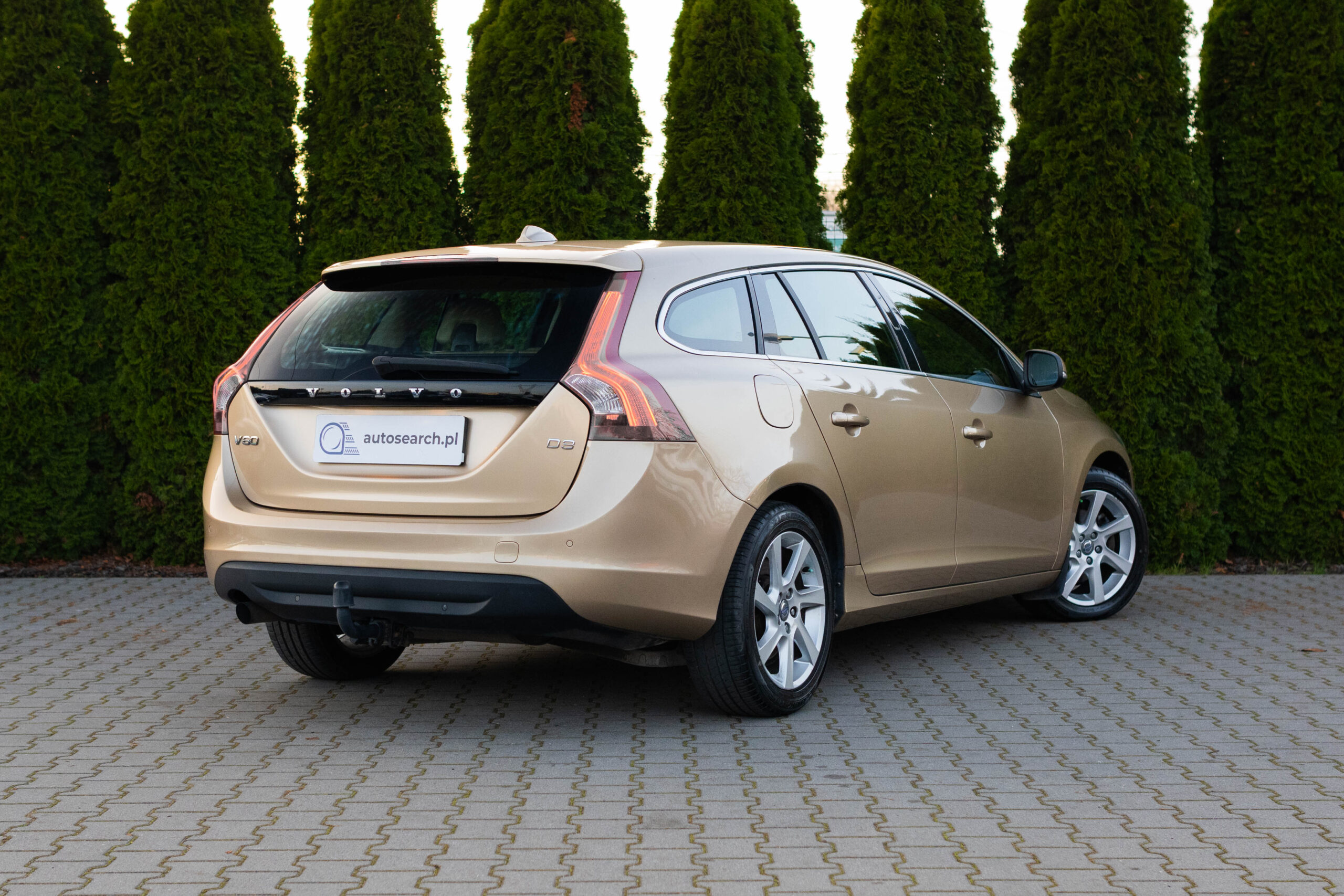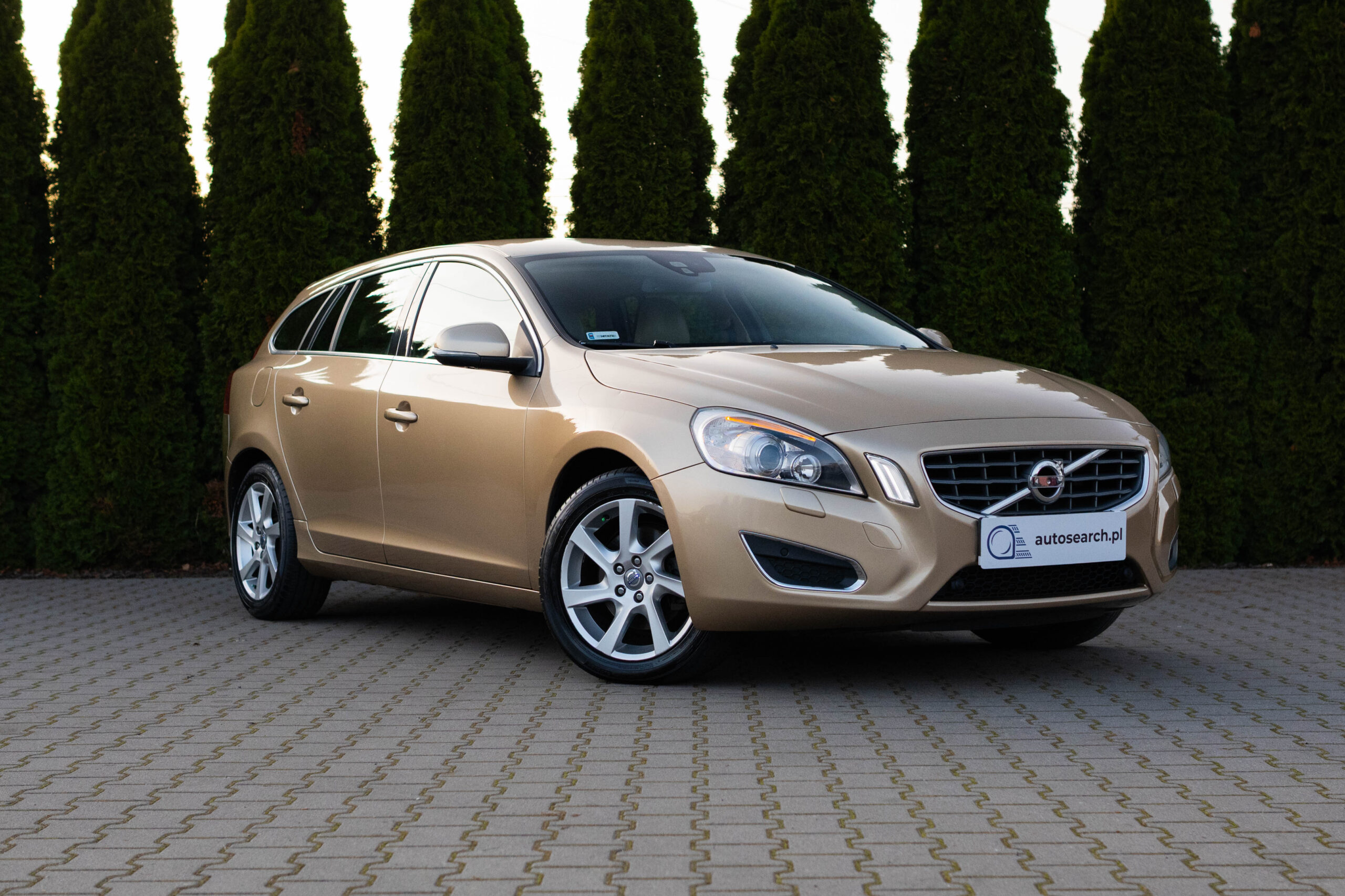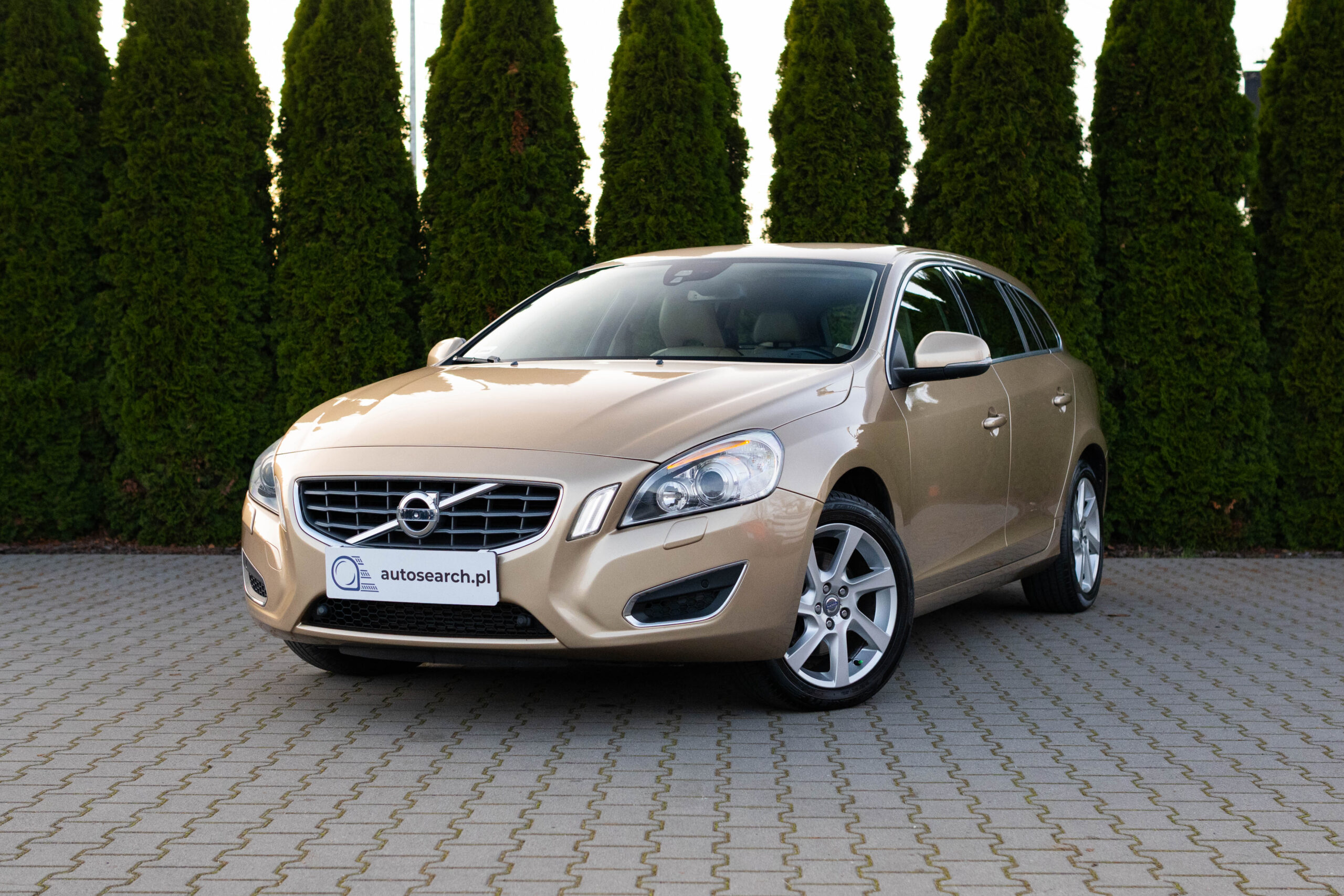 Dziś gościmy Volvo V60 w odmianie wysokoprężnej D3 w bardzo ciekawym zestawieniu kolorystycznym. Rzadki lakier Electrum Gold Metallic łączy się tu z beżowym wnętrzem ozdobionym elementami wykończeniowymi w stylistyce drewna. Ciekawym zabiegiem stylistycznym jest dwukolorowe koło kierownicze, dodające wnętrzu nutę luksusu.